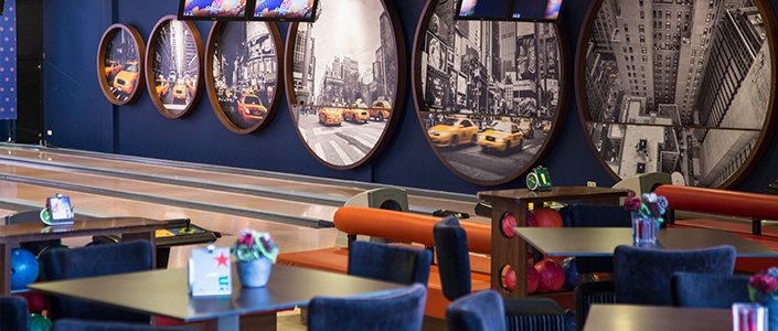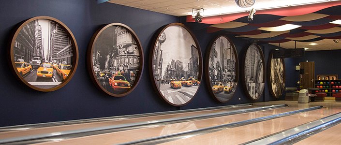 De muren op de bowlingbaan en in het restaurant zijn voorzien van naadloos geprinte wandbekleding (in totaal ruim 200 vierkante meter). De full colour visuals passen goed in de sfeer van Amerika. Zo zijn er beelden gebruikt van Broadway, Time Square en drukke straten met de traditionele yellow cabs.